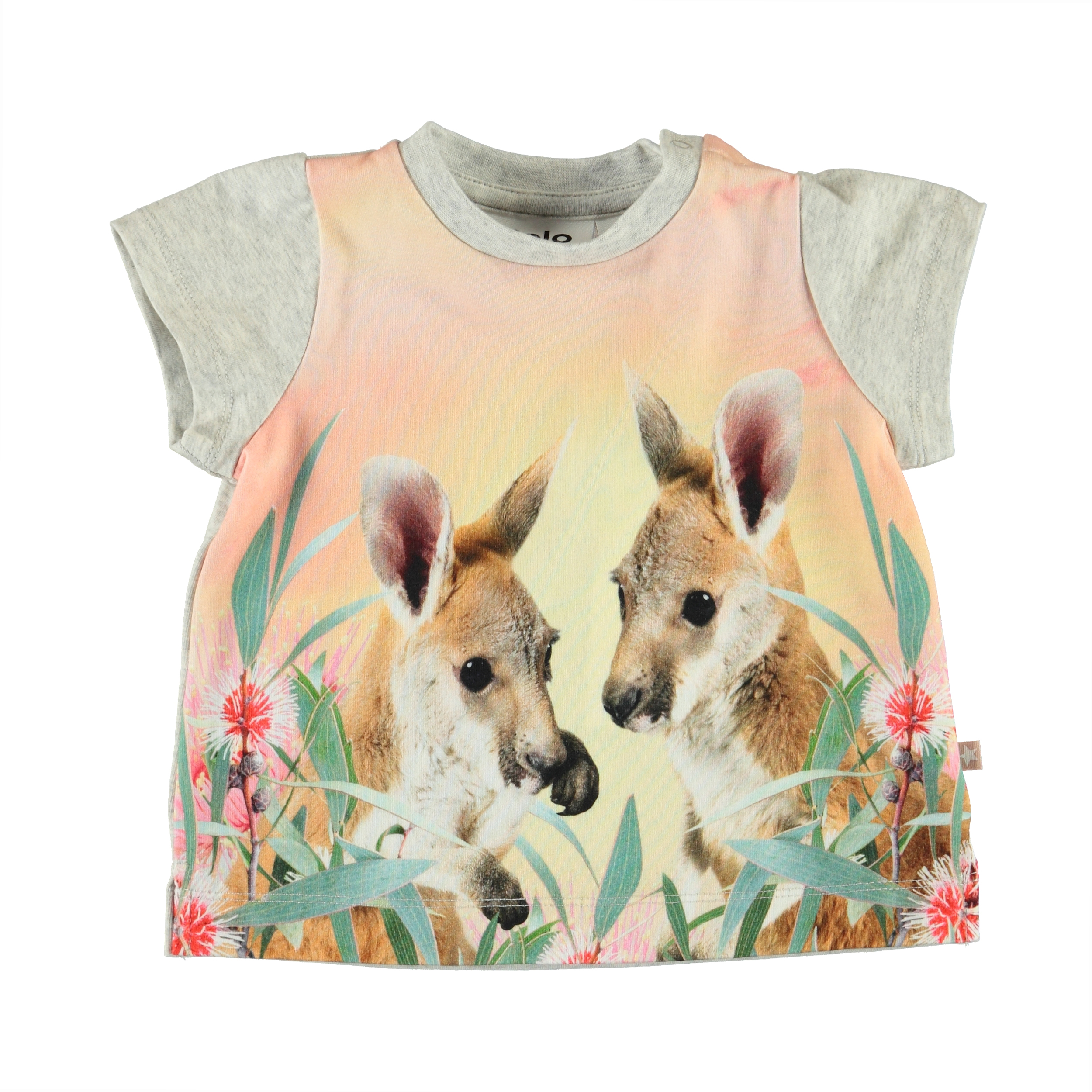 Elly is a grey baby t-shirt with a baby kangaroo print on the front. The t-shirt has an easy single snap closure on the shoulder.