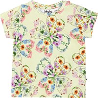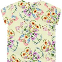 Yellow t-shirt in soft, organic cotton. The t-shirt is in a loose fit and has slits at the side seams. It has small sleeves and a two-snap closure on the back of the shouder for easy dressing. The t-shirt has an all over print in colourful flowers that form a beautiful silhouette of clovers.