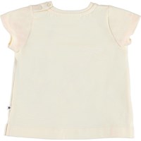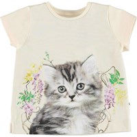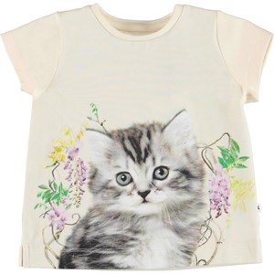 Elly is a baby t-shirt that comes in beige with a print of plants and kittens. It has a snap closure at the neck.