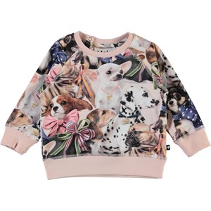 Elsa is a light pink baby top with a print of small dogs with ribbons around their necks. Elsa has raglan sleeves and an easy snap closure at the neck.