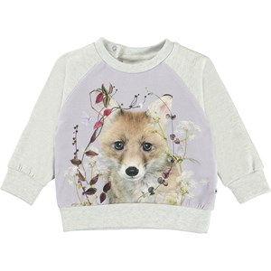 Elsa is a light grey baby top with a print of a fox on the front. Elsa has raglan sleeves and an easy snap closure at the neck.