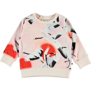 Elsa is a pink baby top with a print of flying cranes. Elsa has raglan sleeves and an easy snap closure at the neck.