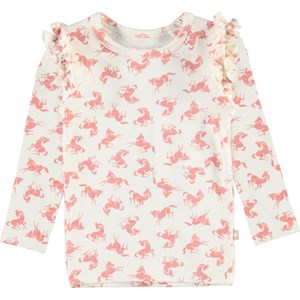 Emma is a white baby top with ruffles and a pink horse print. It has long sleeves and ruffles at the sleeves with a snap on one shoulder.