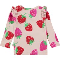 Emma is a long sleeve, pink baby top in 100% organic cotton jersey. Emma has ruffles on the shoulders. It has an easy snap closure on one shoulder. The top is in an strawberry all over print.