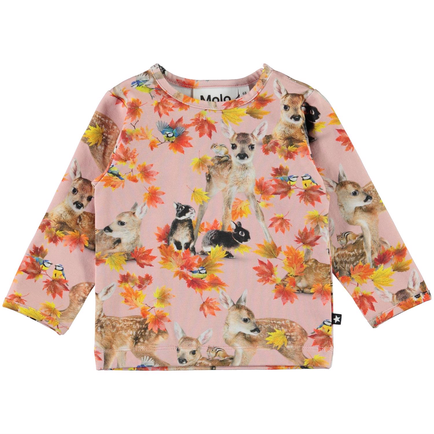 Eva is a pink baby top with a print of deer, rabbits and golden leaves. It has an easy snap closure on one shoulder.