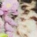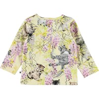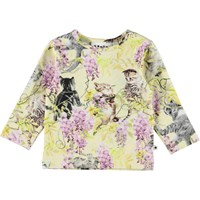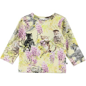 Eva is a light yellow baby top with a print of kittens that are climbing up wisteria. It has a single easy snap closure on one shoulder.