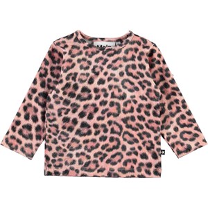 Eva is a pink baby top with a leopard print. It has a single easy snap closure on one shoulder.