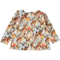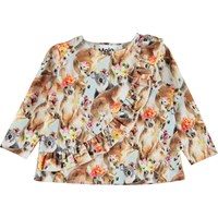 Evelyn is a baby top with an all-over print of kangaroos with flowers on their heads. The top has long sleeves and a slanted ruffle over the front of the top.