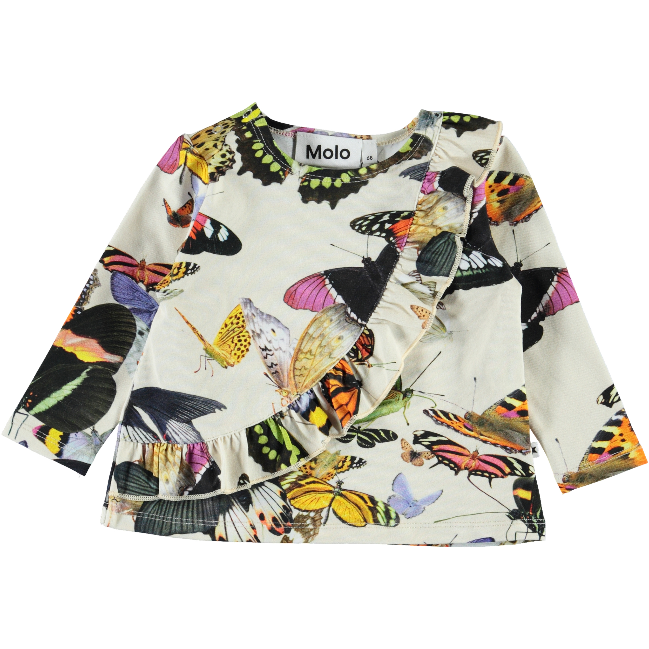 Evelyn is a baby top with an all-over print of colourful butterflies. The top has long sleeves and a slanted ruffle over the front of the top.