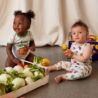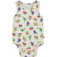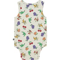 Fabulous is a sleeveless baby bodysuit in off-white and with a print of colourful fruits. The bodysuit has an easy snap closure between the legs.