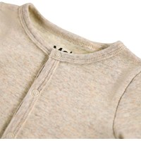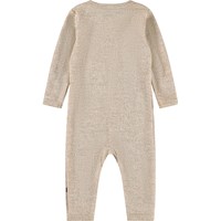Beige baby romper made of Merino wool with long legs and sleeves and snap buttons down the front.
