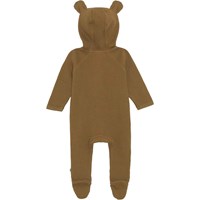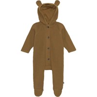 Faith is a rose oloured, waffle knit baby romper with a snap closure on the front and a hood with small, sewn on ears. Please note that the romper has feet for sizes 56-74, while sizes 80-92 do not.