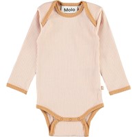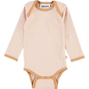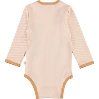 Faros is a pink baby bodysuit in a rib quality with a brown edge tape. Faros has easy snap closure at the collar and the crotch. This product is made of organic cotton. Baby Basics.