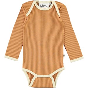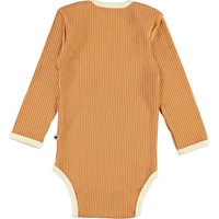 Faros is a brown baby bodysuit in a rib quality with a light yellow edge tape. Faros has easy snap closure at the collar and the crotch. This product is made of organic cotton. Baby Basics.