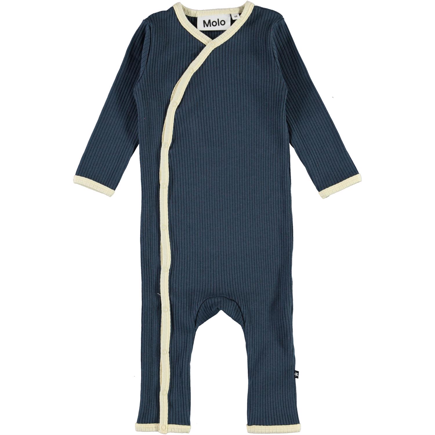 Fellow is a dark blue baby bodysuit with long sleeves and legs. It has a lovely v-neck that continues into a button closure. It has a snap closure down one leg. Baby essentials.