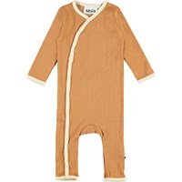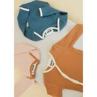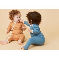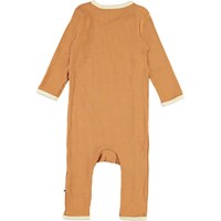 Fellow is a brown baby bodysuit in a rib quality with a light yellow edge tape. It has a lovely v-neck with snaps that continue down the side.