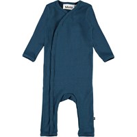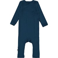 Fellow is a dark blue baby bodysuit in a rib quality. It has a lovely v-neck with snaps that continue down the side.