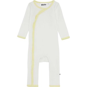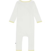 Fellow is a white baby bodysuit in rib with long sleeves and legs as well as a lemon yellow edge tape. It has a lovely v-neck that continues down into a snap closure down the front on one side of the bodysuit.