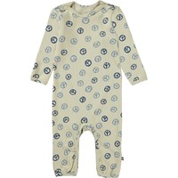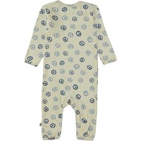 Fenez is a baby romper with long legs and sleeves. It is in grey with a peace sign print. Fenez has an easy snap closure at the shoulder and between the legs.