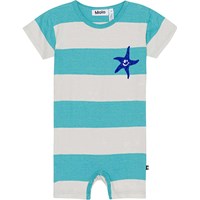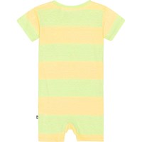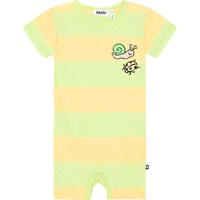 Short sleeve, striped suit in soft cotton. It has an easy snap closure at the neck and between the legs. It is in a loose, comfortable fit for easy movement. The suit has yellow and light green stripes and a small, sweet print of a snail on the chest.