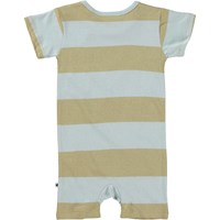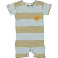 Finn is a striped baby romper in green/brown and blue with a print of a small sun on the chest. The romper has short sleeves and legs. It has an easy snap closure at the neck and between the legs.