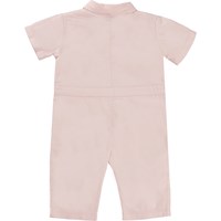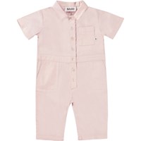 Flo is a rose coloured baby romper with shirt details like a collar, a chest pocket and a button closure on the front. The romper has short sleeves and long legs.