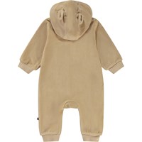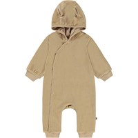 Beige baby romper hood in 100% cotton. It has long sleeves and legs, a snap front closure and a hood with small, sweet ears.
