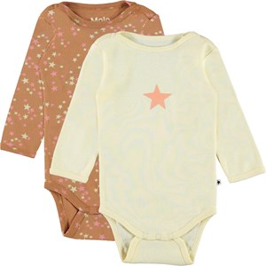 Foss is a long sleeve baby bodysuit. This Foss comes in a 2-pack, with one light yellow bodysuit and one brown one with stars. It has easy snap closure at the neck and crotch.