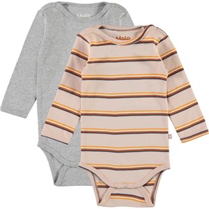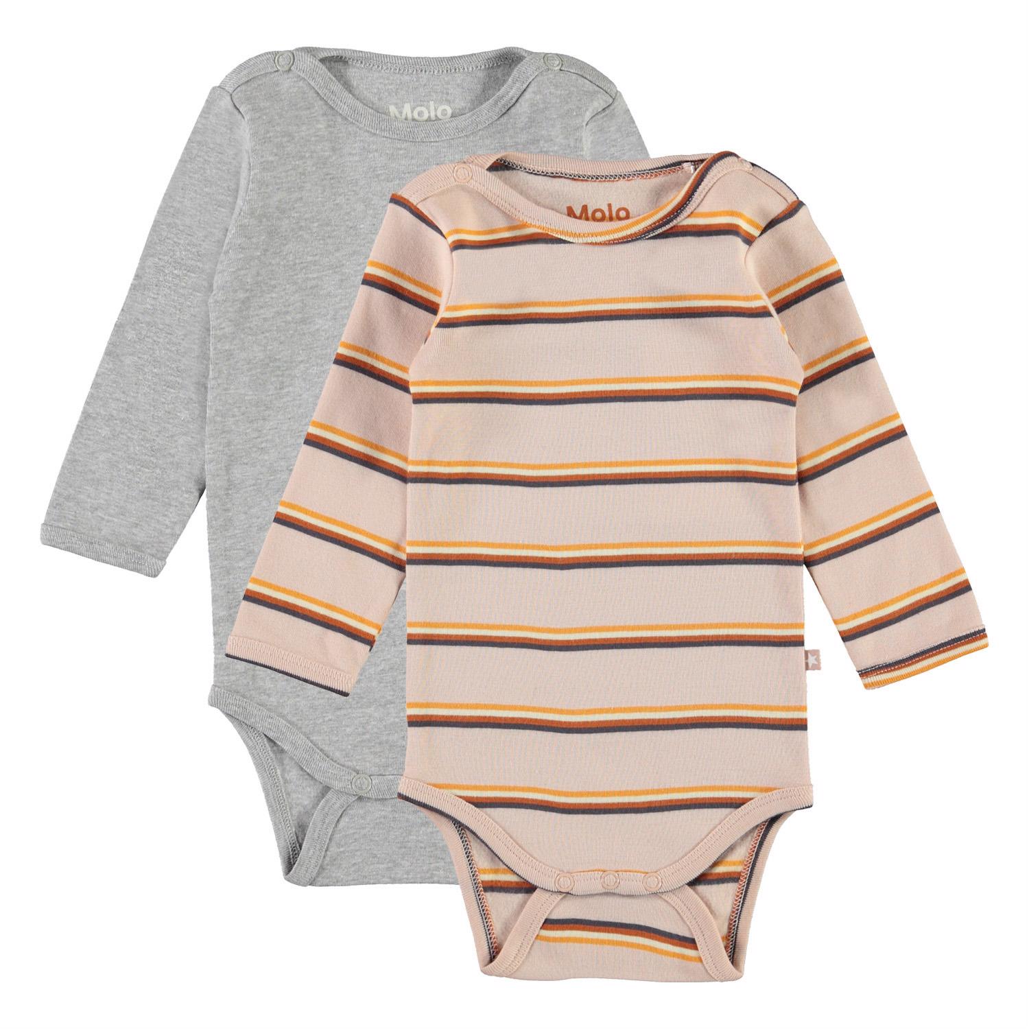 Foss is a long sleeve baby bodysuit. This Foss comes in a 2-pack, with one grey bodysuit and one pink with narrow stripes. It has easy snap closure at the neck and crotch.