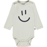Foss is a brown baby bodysuit with a print of a smiley face. Foss has easy snap closure at the neck and between the legs.