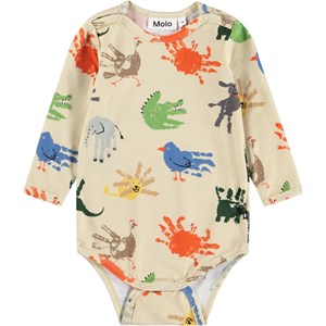 Beige long-sleeved bodysuit for the little ones made of organic cotton with a print of colored handprints drawn as animals. The bodysuit has binding tape and button closure on the shoulders and between the legs for easy dressing and undressing.