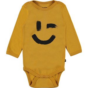 Foss is a long sleeve baby bodysuit in yellow with a smiley face on the front. It has easy snap closure at the neck and crotch.