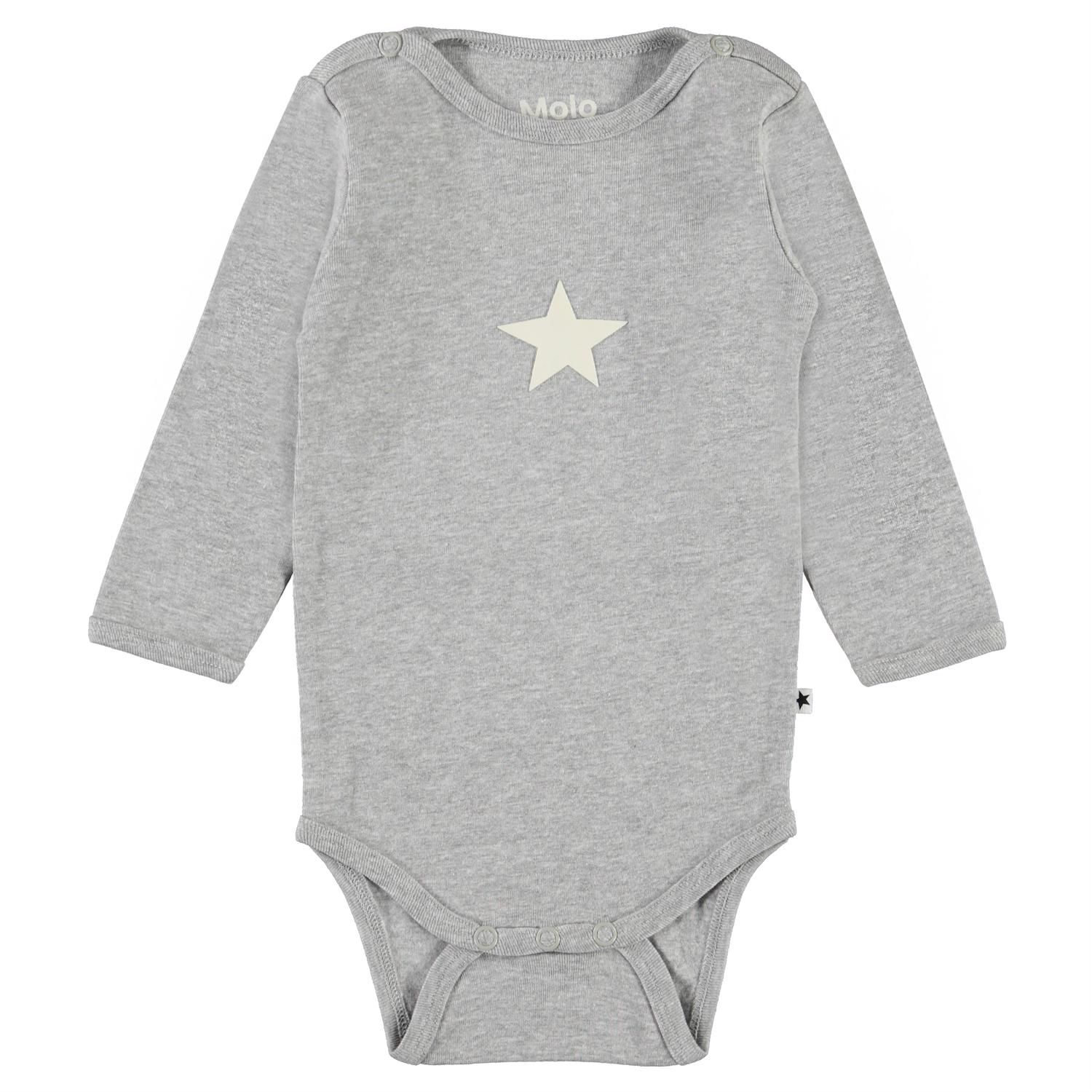 Foss is a long sleeve baby bodysuit in grey. It has easy snap closure at the neck and crotch.