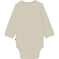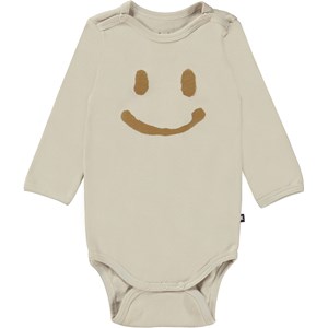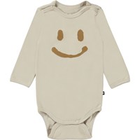 Foss is a beige baby bodysuit with a print of a smiley face on the front. Foss has an easy snap closure at the neck and between the legs.