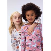 Off-white pyjama set made of organic cotton. The pants have long legs and an elastic waist with a drawstring. The top has long sleeves, a collar, a chest pocket and buttons down the front. The pyjama set has a regular fit and a colourful print of cute drawn animals.