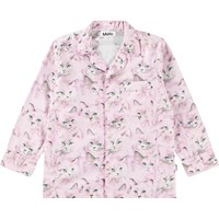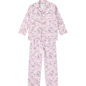 Purple pyjama set in organic cotton with long trousers and an elasticated waist with a drawstring. The top has long sleeves, a collar, a chest pocket, and buttons down the front. The set has a regular fit and an all-over print of cute cats.