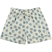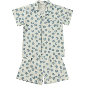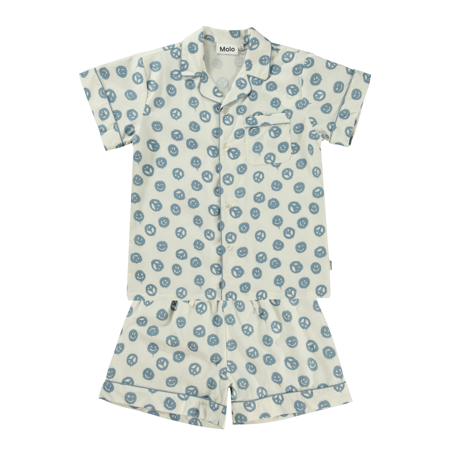 Lexi is a nightwear set in white with a print of small peace signs and smiley faces. The top has short sleeves and a button front closure. The shorts have an elastic waist with ties.