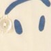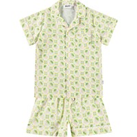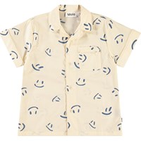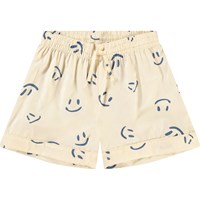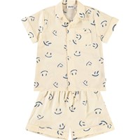 Off-white pyjama set with short sleeves and legs in organic cotton. The shirt has a loose fit, a collar with buttons down the front, a chest pocket, and rolled-up sleeves. The shorts have a loose fit, go to mid-thigh, and have elastic and a drawstring at the waist. The set features an all-over print of smiling dark blue faces.
