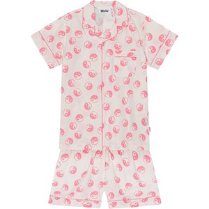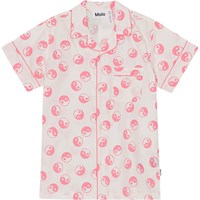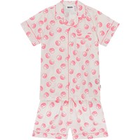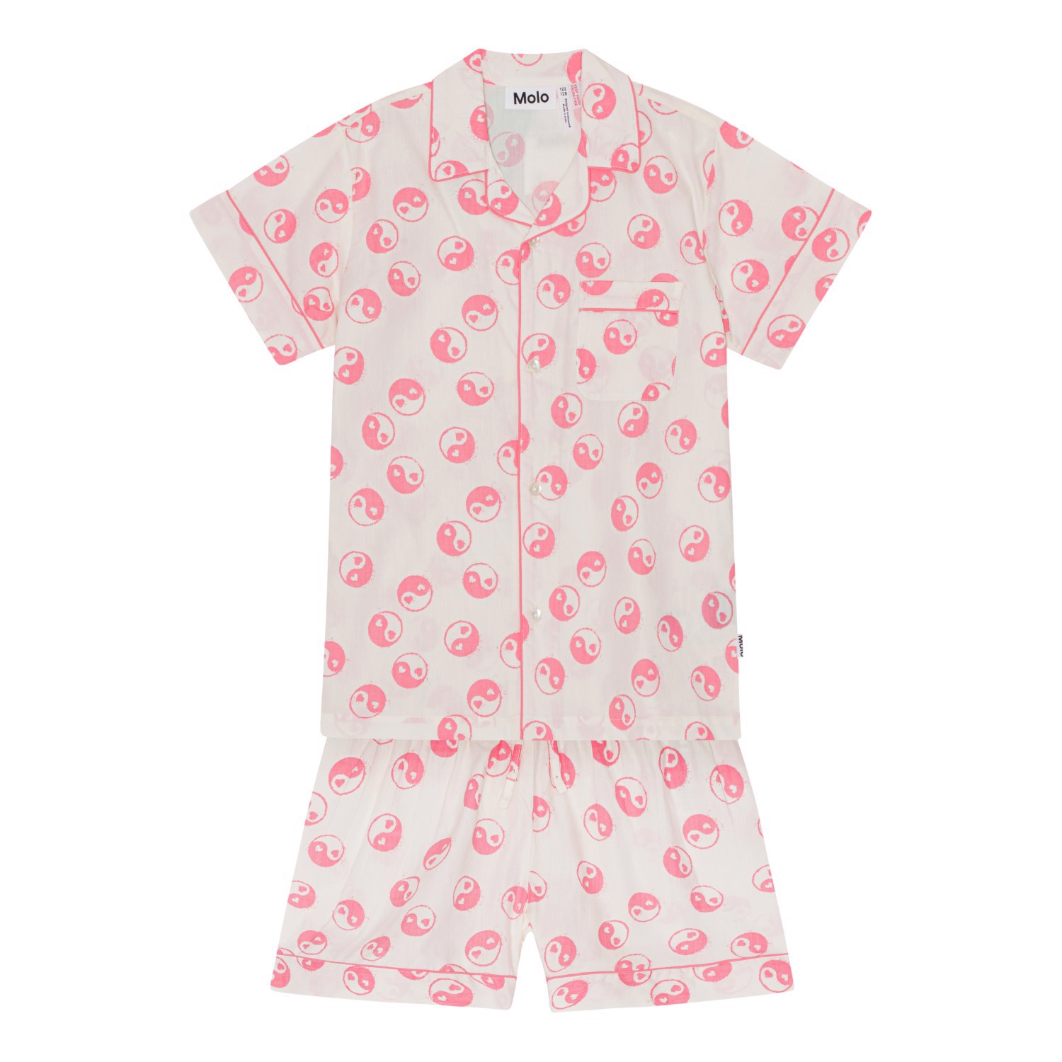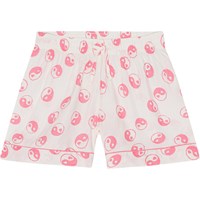 Off-white nightwear shorts set in soft, organic cotton. The shirt has short sleeves, roll up at the sleeves, a chest pocket and a lovely collar. The shorts have wide legs with roll up and an elastic waist with a drawstring for a comfortable fit. The set is in an all over print of yin/yang symbols in off-white with an edge tape in the same colour for a refined finish.