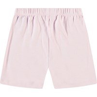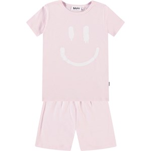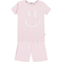 Pink pyjamas with short sleeves and legs in stretchy organic cotton. The set is divided into two parts and consists of a loose t-shirt with a round neck and a pair of shorts with an elastic waistband, making them comfortable to wear. The set features a smiling white face on the front.