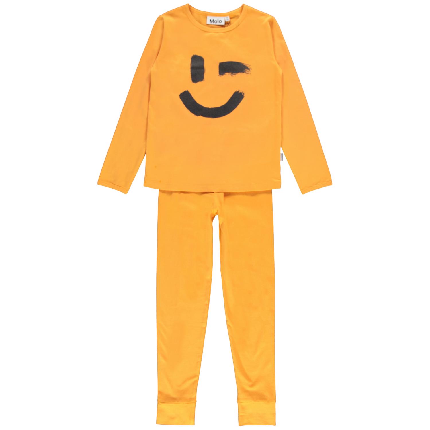 Two-part, long sleeve nightwear set in orange with a smiley face print on the top. The trousers have ties at the waist.