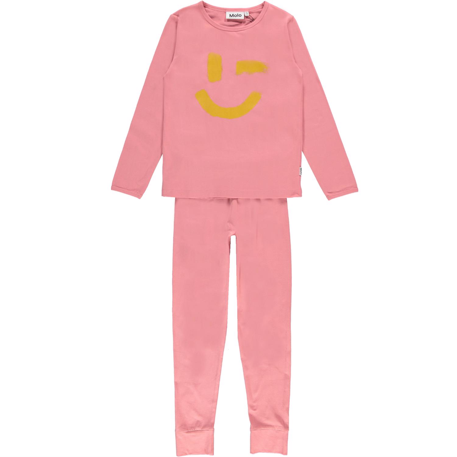 Two-part, long sleeve nightwear set in pink with a smiley face print on the top. The trousers have ties at the waist.