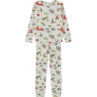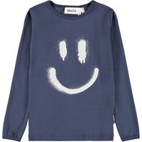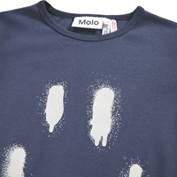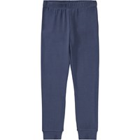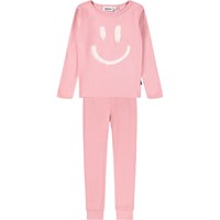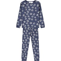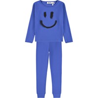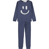 Dark blue pyjama set made of organic cotton. The pants have an elastic waist and ribbed cuffs at the ankles. The top has a round neckline and a placed print on the front. The print is a large, spray-painted smile in white.