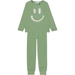 Nightwear set in green with a smiley face print on the top. The bottoms have an elastic waist with ties.