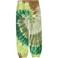 Adan is a pair of unisex sweatpants with a green and brown tie dye print that's going around in a spiral. They have elastic at the ankles and waist as well as front pockets and a single patch pocket on the back.