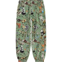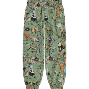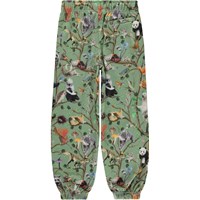 Green joggers in an all over print of animals in the Tree of Life. Just like the tree's root system, all the mushrooms, birds, trees and bears, large and small, are linked together. That's why we have to watch out for each other. These joggers are in 100% cotton. They have elastic and an inner tie at the waist as well as elastic at the legs and side and back pockets. The joggers are in a reguler fit.