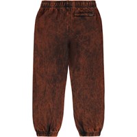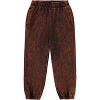 Sweatpants made of soft organic cotton in a red and black wash. The sweatpants have an adjustable elastic waist, side pockets, a single back pocket and elastic around the ankles.