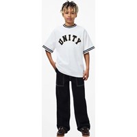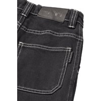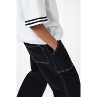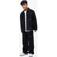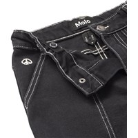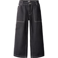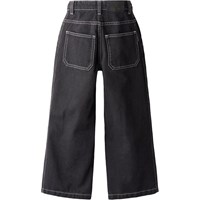 Black jeans made of organic cotton denim with wide legs and distinctive contrast stitching. The trousers have large front pockets, belt loops, and an adjustable elastic waistband for an optimal fit. The smallest sizes (92-134) have a practical press stud, while sizes 140-176 are equipped with a classic jeans button.
