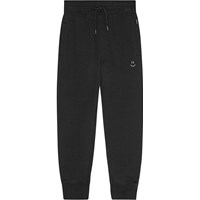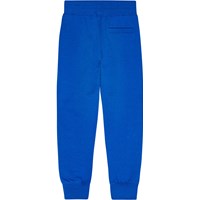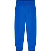 Blue sweatpants in organic cotton with an elastic waistband and an internal drawstring. The trousers have zip pockets and a secure ribbed cuff at the ankles. They have a regular fit and a small embroidered face by the pocket. The trousers have a brushed inner side, making them soft and warm to wear.