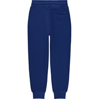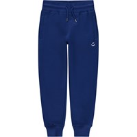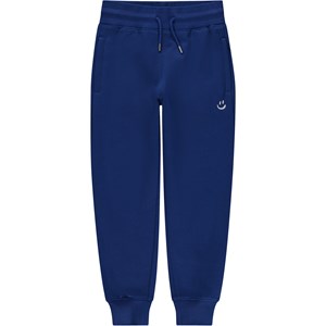 Blue joggers with a small, white smiley face embroidery on the front. These joggers are in 100% cotton. They have elastic and ties at the waist, rib at the legs, hidden zip pockets at the sides and a back pocket. These joggers are in a regular fit.